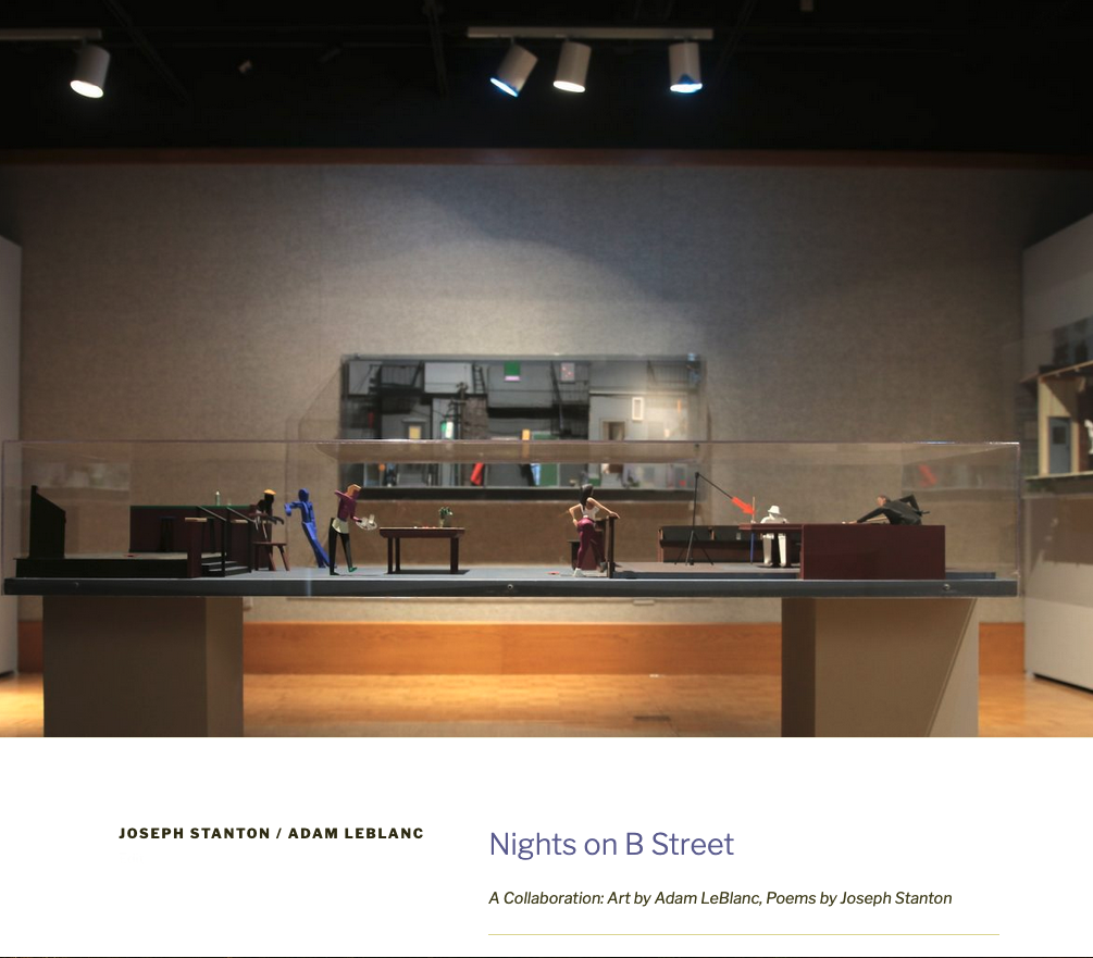 Stanton: Since the late 1980s I have often participated in an art exhibition at Ho‘omaluhia Gardens that we call “Aloha Ho‘omaluhia.” Most years, that exhibition is in place for the month of May. Some years I have collaborated with visual artists to make a few broadsides to display at that exhibition. I often, also, present a brief poetry reading at the opening reception for that art show. It is exciting to share nature poems amidst artworks by that group of outstanding artists. I have also often collaborated with the artist Adam LeBlanc. For those collaborations, Adam and I talk at length about his artworks and then I endeavor to write poems that parallel what is going on in the visual work. When we display the poems next to the artworks, an interesting conversation takes place between the images and the words. The artworks and the poems present worlds that are parallel and intimately interinvolved; but, of course, not entirely the same. Our first collaboration of that sort was an exhibition of light boxes by Adam that he called Conjuring Heroes. Adam was given a solo show in 1994 at the Koa Gallery at Kapi‘olani Community College to exhibit those works. For that show I composed a sequence of poems. My poems address ideas and imagery suggested by each light box. The contents of each poem were heavily influenced by my conversations with Adam. I printed my poems in large type, and each poem was shown on the wall next to the light box it endeavored to evoke. I published that sequence of poems in Chaminade Literary Review and subsequently included it in my 1999 book Imaginary Museum. Two other sequences of my poems inspired by the works of Adam LeBlanc have been displayed on the walls for exhibitions of his work. Those more recent poems were included in my 2022 book Prevailing Winds. One of those sequences gave the book its title. My most exciting collaboration with Adam involved a multi-dimensional work of his called Nights on B Street.