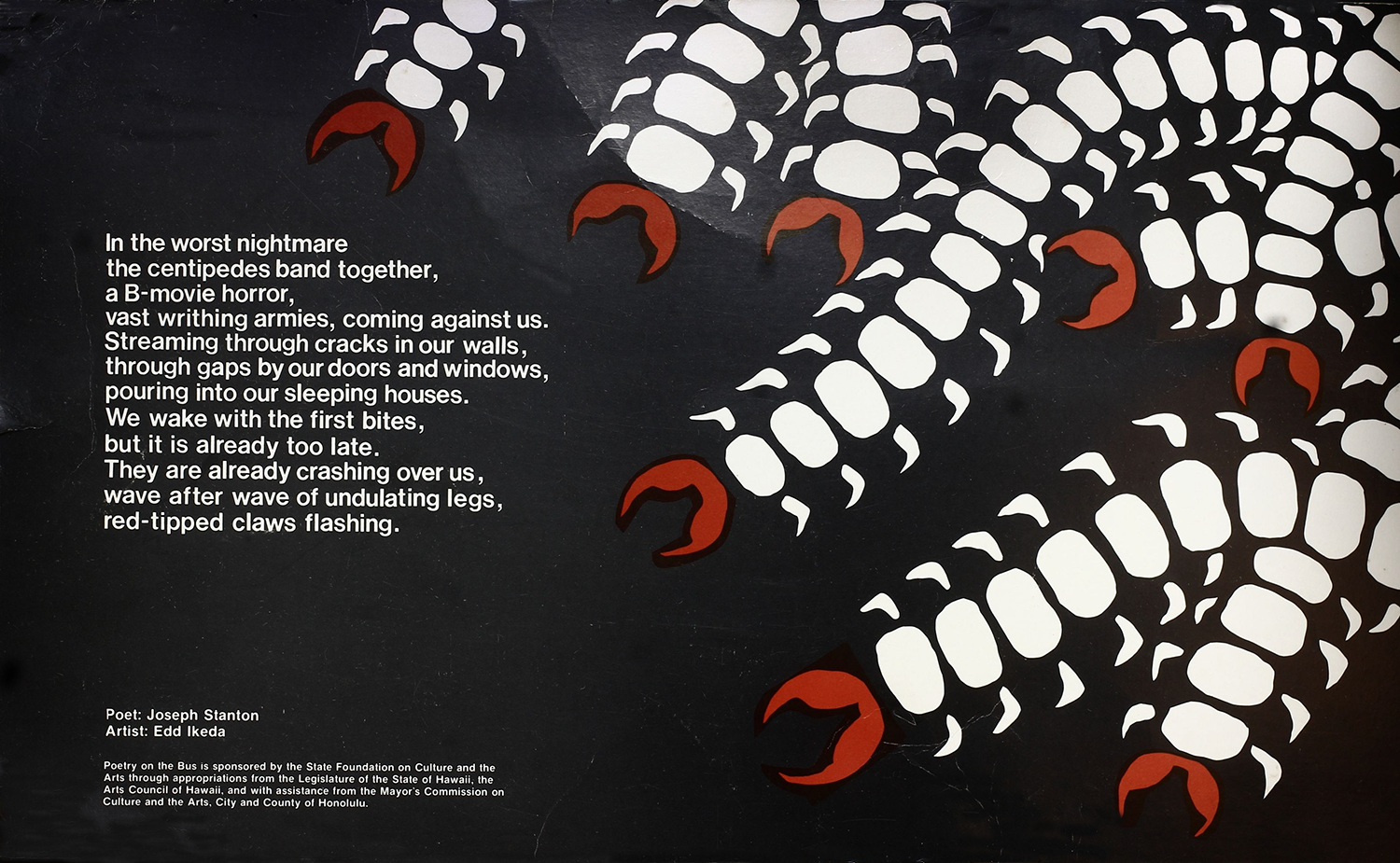 Stanton: In the late 1980s, Elaine Murphy, who was the arts director for the City of Honolulu, got the idea that it would be exciting to have a bus-poster contest, which she called “Poetry on the Bus.” In some cases, individuals submitted entries in which they created both the poetry and the graphics. Joe Balaz, working alone, created a very funny poster that became very popular. In other cases, artists and writers collaborated. The husband-wife team of Tony Quagliano and Laura Ruby were frequent winners. The contest ran for several years. In 1987, I decided to ask the talented artist Edd Ikeda to collaborate with me. We decided to use a short excerpt from my long poem “Centipedes,” a piece that had originally appeared in Bamboo Ridge. In the poster, Edd’s stylized swarm of centipedes attacks the words of my poem. I still have a copy of the poster, which I sometimes hold in front of me at poetry readings while reading the poem. I subsequently included that poem in my Field Guide.